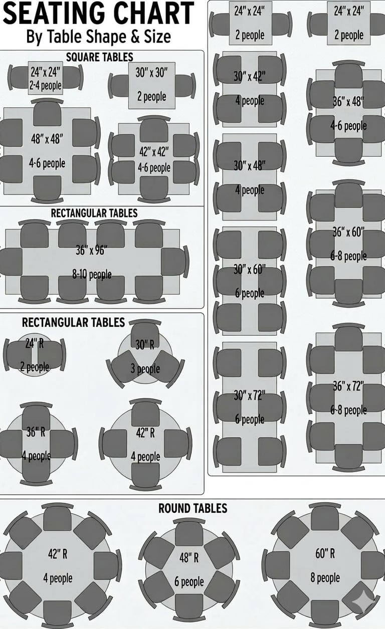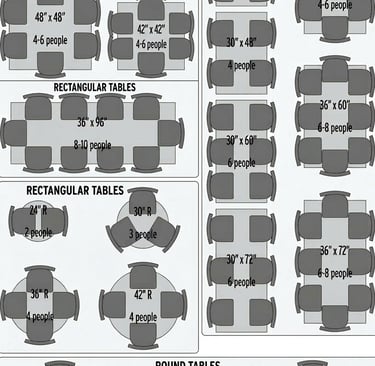 We carry standard sizes and the size of chose as seating chart below. We have many custom options, please call for further information.